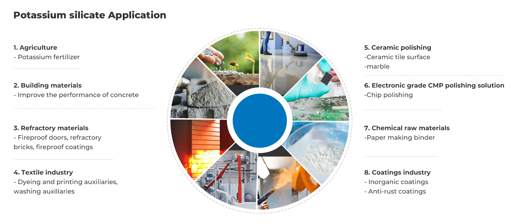 Rakennuksen ulkoseinien suojauksen kannalta tärkeä rooli on myös kaliumsilikaatilla, jonka moduuli on 4,8-5,0. Rakennusten ulkoseinät ovat pitkään alttiina luonnolliselle ympäristölle, tuulen, auringon, sateen, lumen ja pakkasen vaikutuksille, ja ne ovat alttiita halkeilemaan, haalistumaan ja muihin ongelmiin. Tätä kaliumsilikaattituotetta voidaan käyttää tärkeänä komponenttina rakennusten ulkoseinien suojapinnoitteissa. Se voi tunkeutua seinän sisäpuolelle ja muodostaa läpinäkyvän suojakalvon pinnalle. Tämä suojakalvo ei voi vain estää kosteuden tunkeutumista ja estää seinää kosteuttamasta ja homehtumasta, vaan myös vastustaa ultraviolettisäteilyä ja vähentää ulkoseinän pinnoitteen haalistumista ja ikääntymistä. Sen hyvä ilmanläpäisevyys mahdollistaa seinän sisällä olevan kosteuden tasaisen poistumisen, jolloin vältetään kosteuden kertymisen aiheuttamat seinävauriot, suojaten näin rakennuksen ulkoseinää ja parantaen rakennuksen kauneutta ja kestävyyttä.